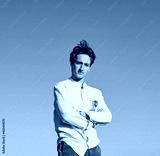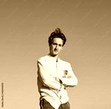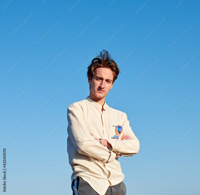 A Caucasian man from Spain in a beige shirt with glasses hanging off of him on clear sky background
