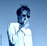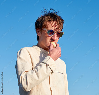 A Caucasian man with glasses from Spain eating a ripe yellow banana on clear sky background