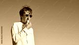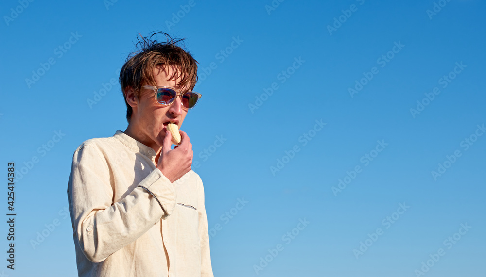 A Caucasian man with glasses from Spain eating a ripe yellow banana on clear sky background