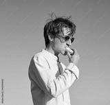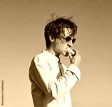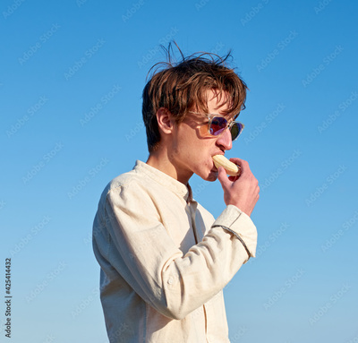 A Caucasian man with glasses from Spain eating a ripe yellow banana on clear sky background