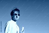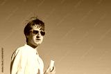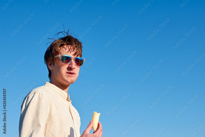 A closeup of a Caucasian man with sunglasses from Spain holding a ripe yellow banana on clear sky background