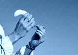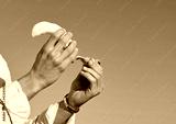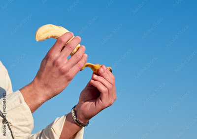 A closeup of a Caucasian man from Spain peeling a ripe yellow banana on clear sky background