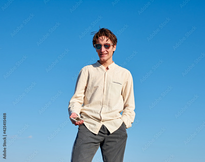A Caucasian white man in a beige shirt standing up while holding his phone and with one hand in his pocket on clear blue sky background