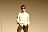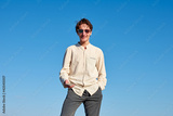 A Caucasian white man in a beige shirt standing up while holding his phone and with one hand in his pocket on clear blue sky background