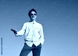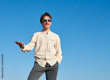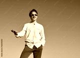 A Caucasian man holding his phone and smiling while looking forward with one hand in pocket