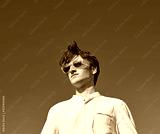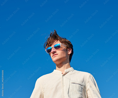 A Spanish white man with long hair, purple glasses and a beige shirt staring into the distance on clear blue sky background