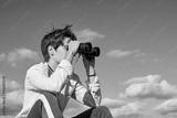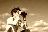 A Spanish white man in a beige shirt looking through binoculars on cloudy sky background