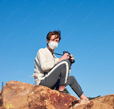 A front view of an explorer from Spain wearing a mask sitting on a rock looking into the camera and holding binoculars on a sunny day