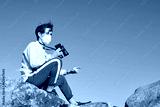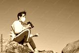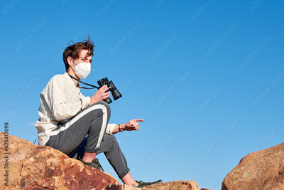 A front view of an explorer from Spain wearing a mask sitting on a rock looking into the camera