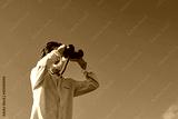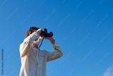 A closeup side view of a young man wearing a white shirt and a face mask looking through binoculars