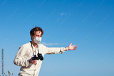 A shallow focus shot of a satisfied young man from Spain wearing a mask showing what he found with binoculars