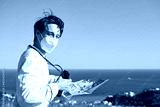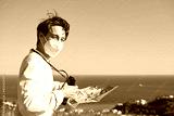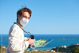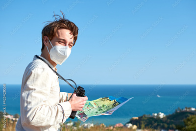 A closeup of a young explorer from Spain In search of mountains observing a map over a coastal town
