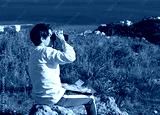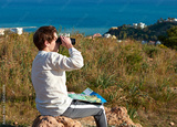 A vertical shot of an explorer from Spain in a white shirt sitting on a rock looking through binoculars using a map