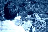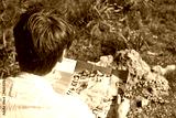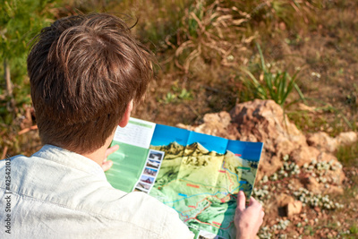 A closeup of a young explorer from Spain In search of mountains observing a map