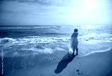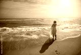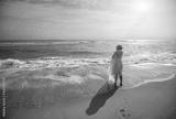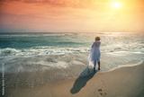 The young woman in a white dress with pareo on the beach on a sunny day in summer. The woman looks at the sea