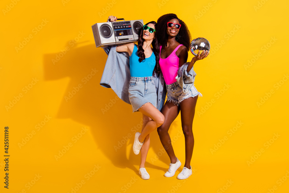 Photo of two ladies hold disco ball recorder look empty space wear sunglass jeans outfit isolated yellow color background