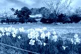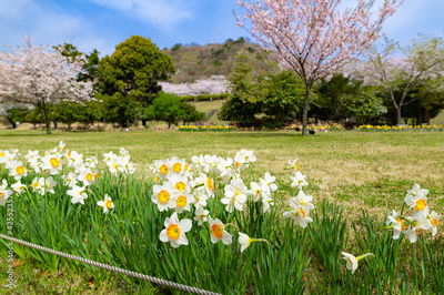 スイセンと桜咲く東伊豆クロスカントリーコースの芝生広場