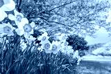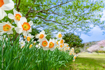 スイセンと桜咲く東伊豆クロスカントリーコースの芝生広場