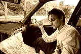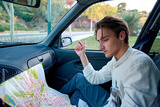 A Caucasian man from Spain sitting in his car and looking at a paper map - tourism and travel