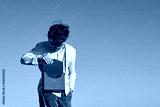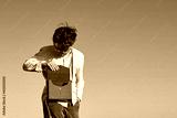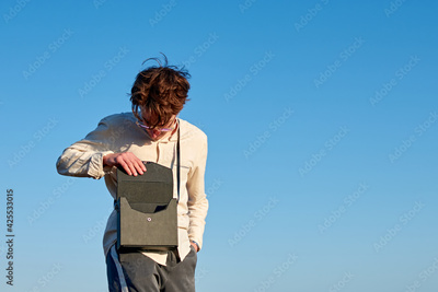 A Caucasian man from Spain standing and opening his black handbag on clear sky background