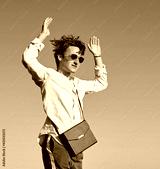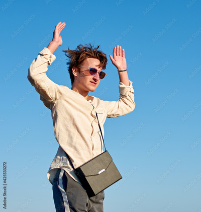 A Caucasian man from Spain wearing a black purse with his hands up on clear sky background - threat
