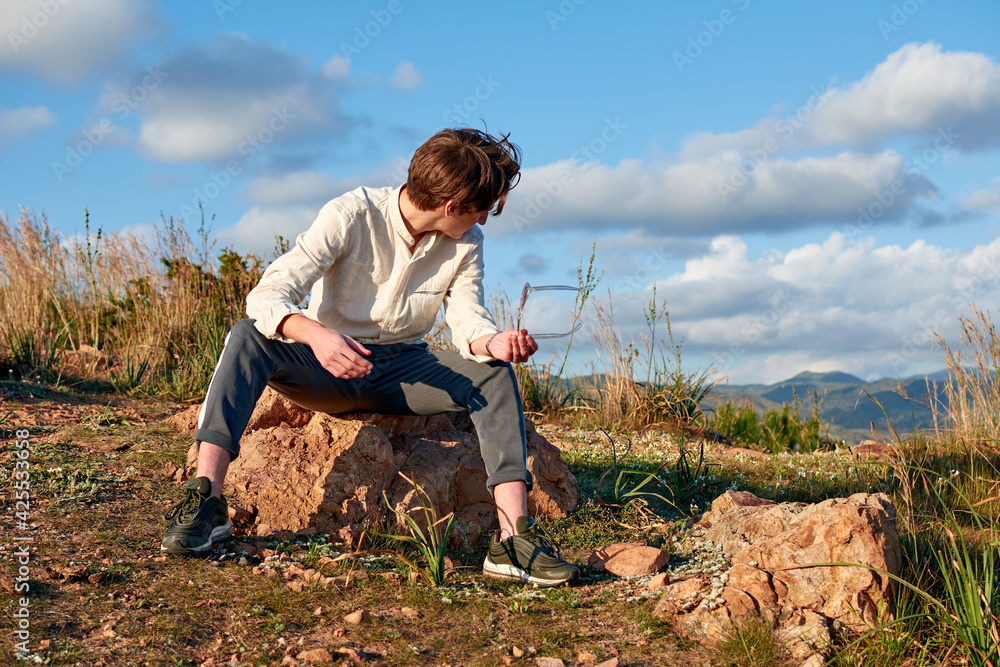 A Caucasian man from Spain sitting and looking to the side on a rock in a mountainous and cloudy area