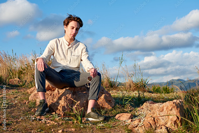 A Caucasian man from Spain sitting on a rock and holding his glasses in a mountainous and cloudy area