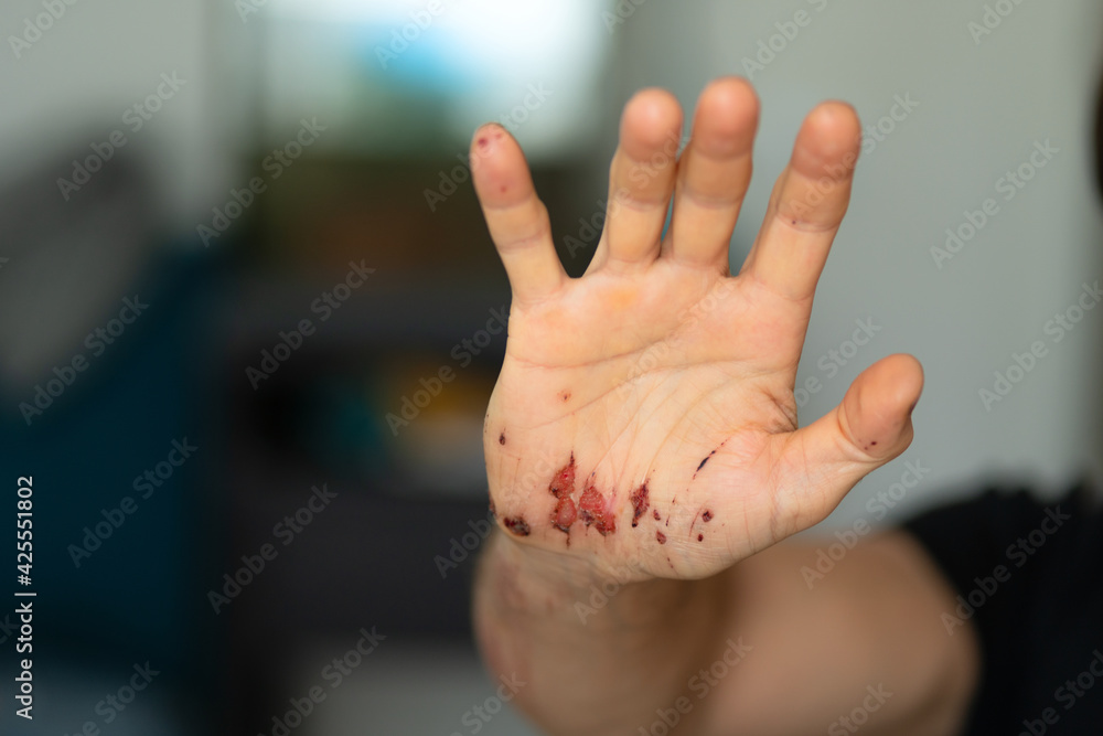 Abrasions on the palm and scratches on the right arm of an adult man. Home treatment.