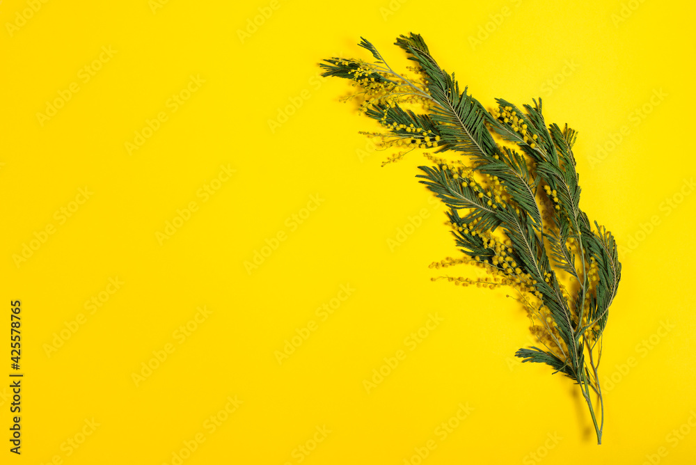Branch of Acacia dealbata, the silver wattle, blue wattle and mimosa isolated on yellow background. Spring celebration concept banner with copy space.