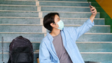 Young asian university student holding mobile phone and making video call while wearing protection mask at campus, social distancing, covid 19