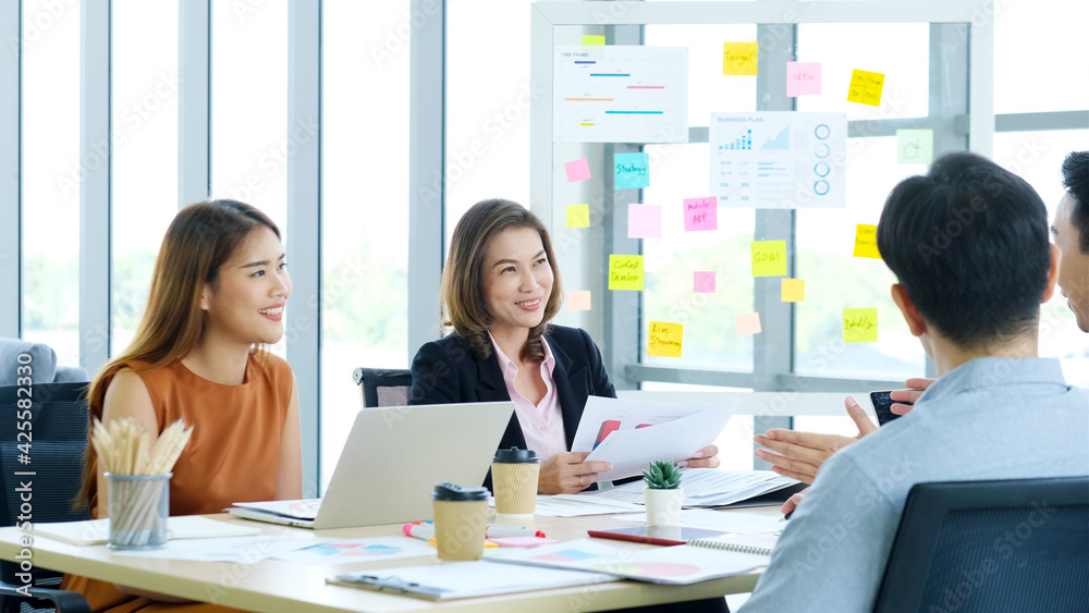 Young asian creative design meeting brainstorm ideas to plan and develop project together in office, Two asia small business startup coworker, colleagues working for the solution