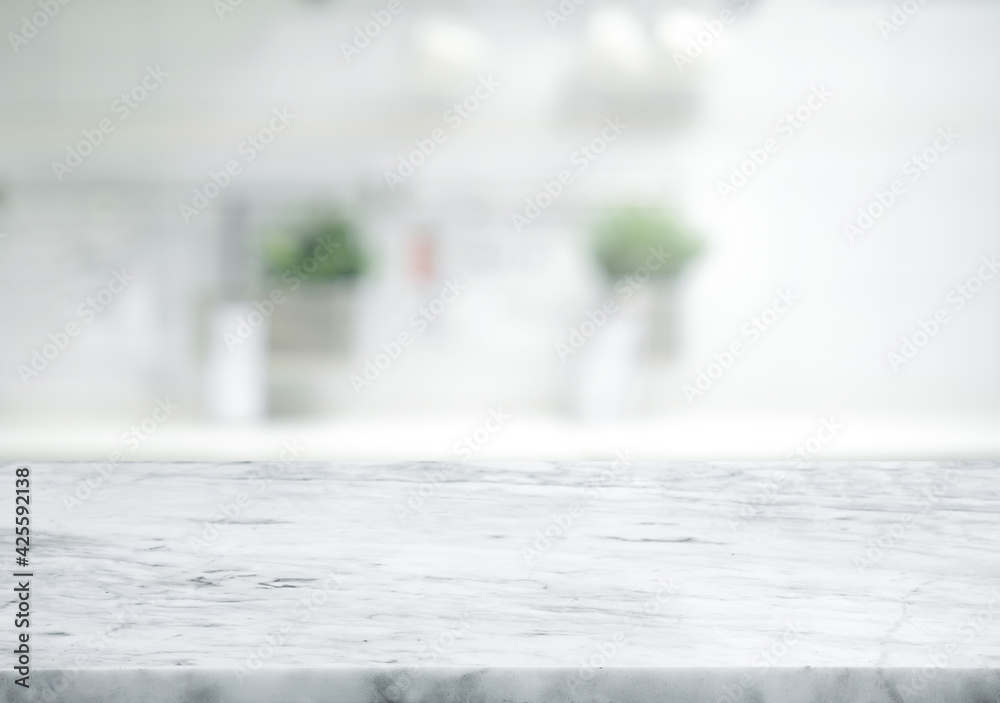 Selective focus.Marble table top on blur white kitchen room background.