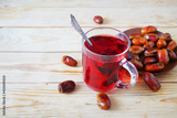 Eastern sweets with nuts, candy, metal vase, tea, dates on wooden background, closeup
