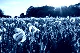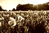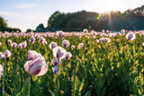Pink Opium Poppy field in a rural landscape in sunny day. Selective focus.