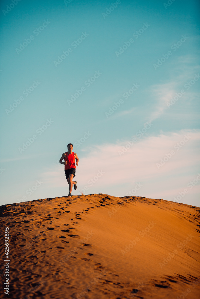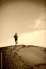 Running man athlete silhouette running across desert dune far away in sunset. Summer day warm up sport training . Vertical background.