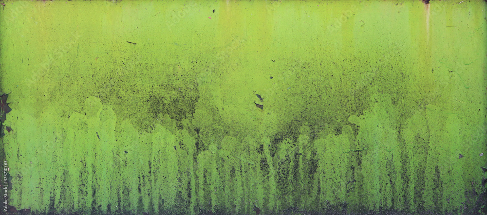 horizontal green metal plate, with dripping dirt drawing silhouettes resembling a group of people - artistic abstract background