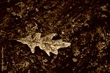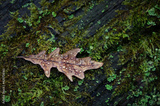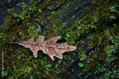 autumn oak leaf with water drops, dark natural moss background. fall season concept. flat lay