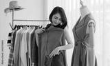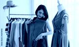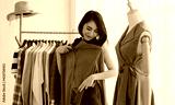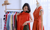 Smiling Asian woman Choose and try on clothe orange color in the Tailor shop. Fashion designer standing in clothing In order to repair, service for customers. Concept Profession Dressmaker designer.