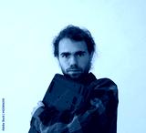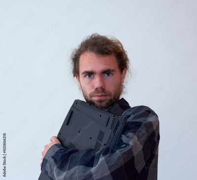 A closeup of a Spanish young bearded male holding a laptop on the white background