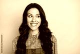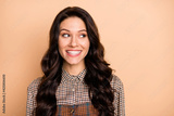 Portrait of pretty cheerful curious wavy-haired girl looking aside copy space ad isolated over beige pastel color background