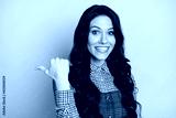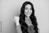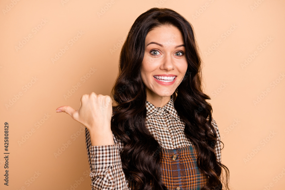Portrait of attractive cheerful wavy-haired girl demonstrating copy empty blank space isolated over beige pastel color background