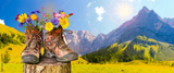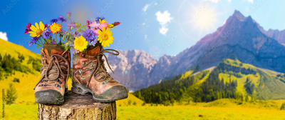 walking boots with flowers in beautiful rural landscape
