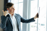 Happy Young business man using digital tablet for video conference to colleague in office at company near window Handsome guy wear suit and shirt He get satisfied Business and technology concept