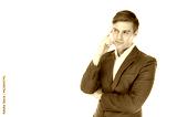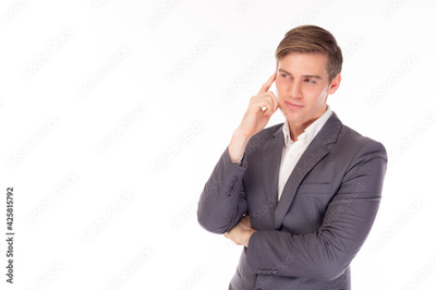 Young handsome clever man in suit looking to copy space thinking or dreaming Business executive guy with short hair, standing over isolated on white background Thoughtful businessman having good idea