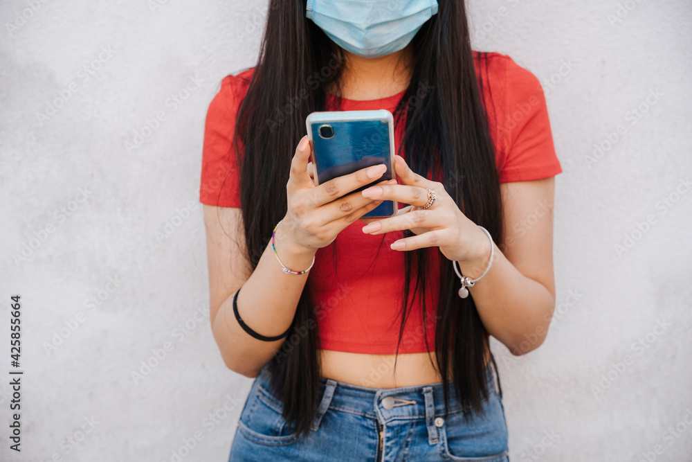 Portrait of a young unrecognizable woman using smartphone on white wall in the city with facial surgical mask for protection from Coronavirus, Covid-19 - Millennial having fun with her friends online