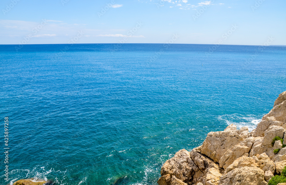 View of big rocks next to blue sea near the city of Nice, France, in the French Riviera