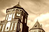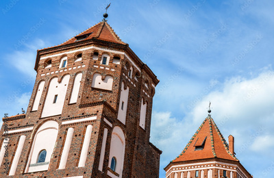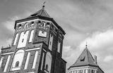 Medieval castle in Mir, Belarus. Side view of towers under cloudy sky in summertime. One of the most famous attractions of the country