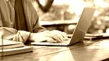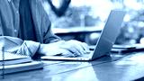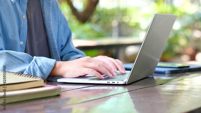 Close up of man hand tying laptop computer while sitting in campus, online class, e learning