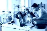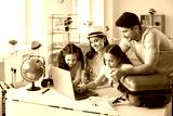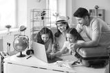 Happy people planning holiday trip. Family getting ready for travel vacation using laptop computer to monitor prices, pick airline, buy tickets, purchase flight, look for rentals or book hotel room