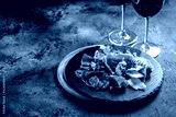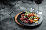 Antipasto board with sliced meat, ham, salami, cheese for red wine. Traditional Spanish meat snacks on a slate board